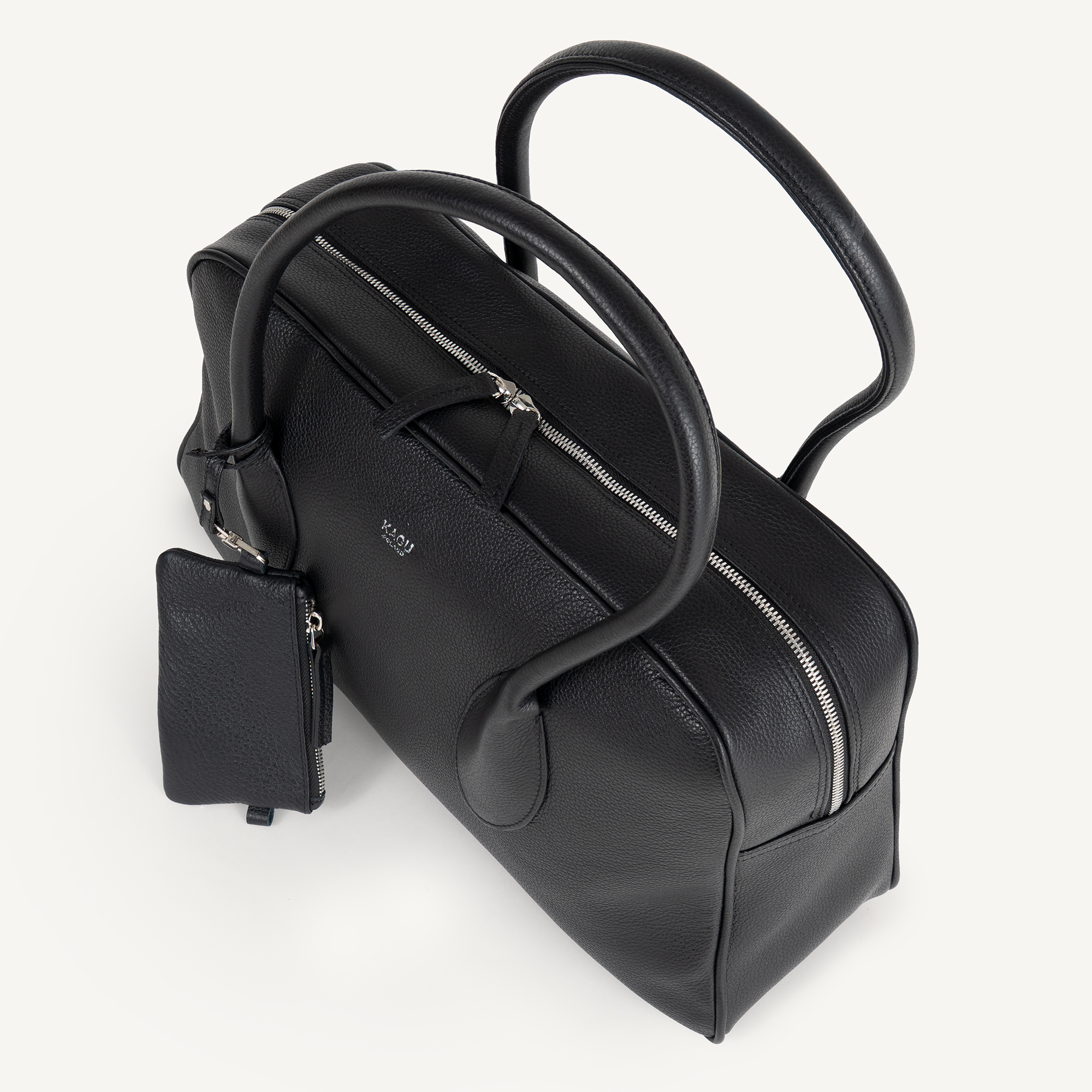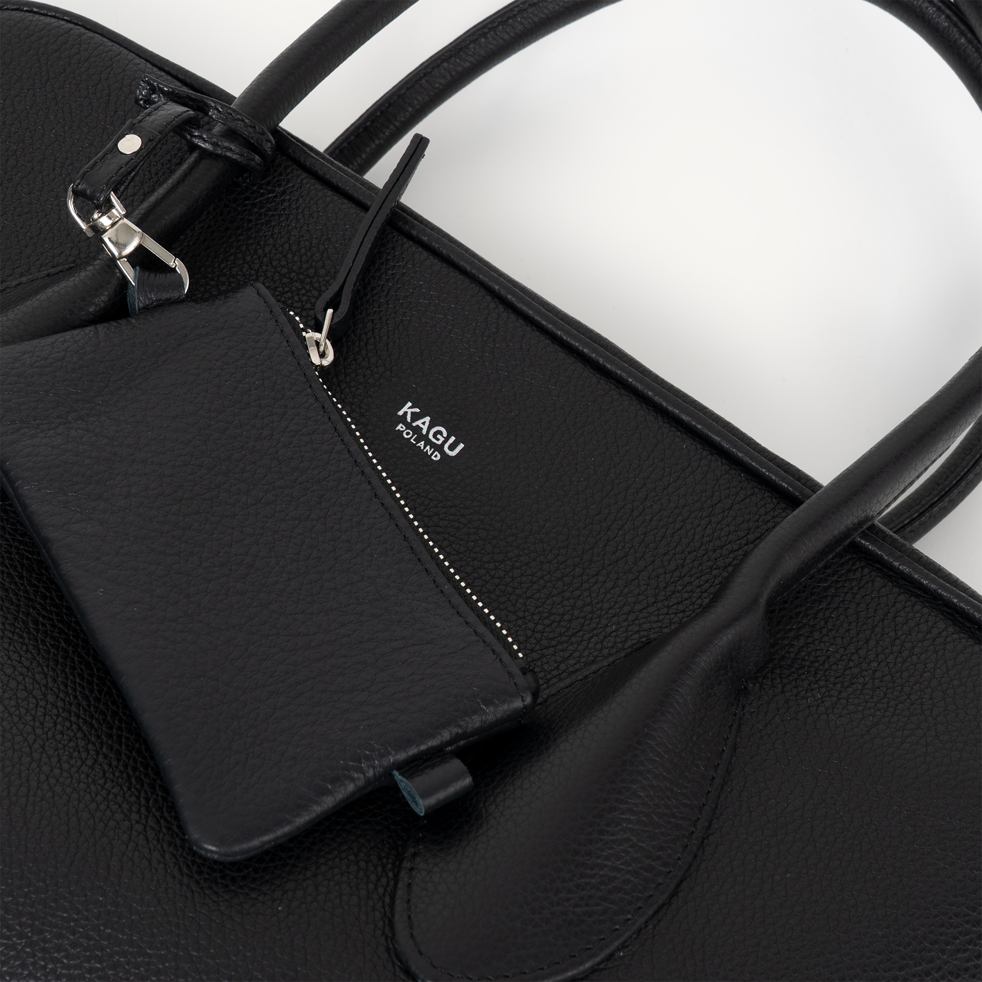 Duża torba wykonana z bydlęcej skóry groszkowej. Główna komora zamykana na zamek dwustronny, wewnątrz kieszonka na suwak wpuszczona w boczną krawędź torby oraz przegroda na laptopa z zabezpieczającym zapięciem. Z przodu wybity srebrny stempel. W zestawie z odczepianą saszetką na drobiazgi.