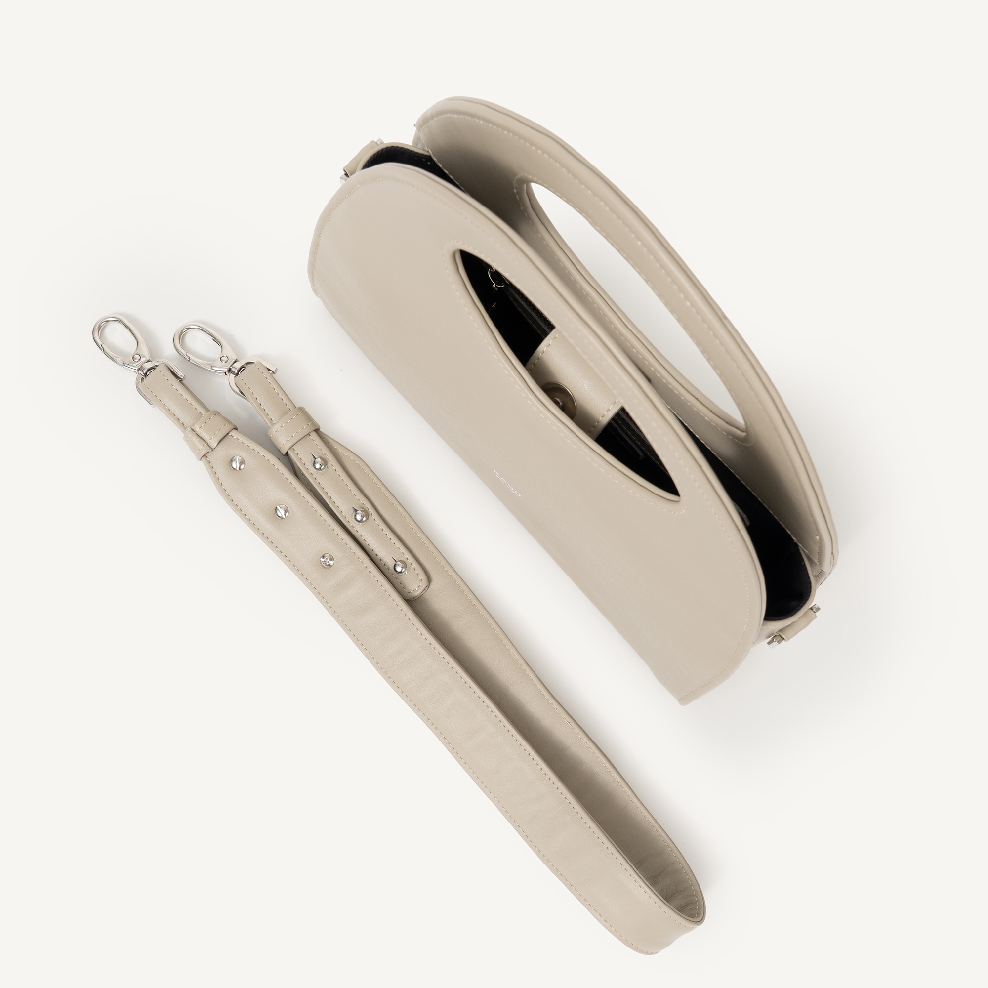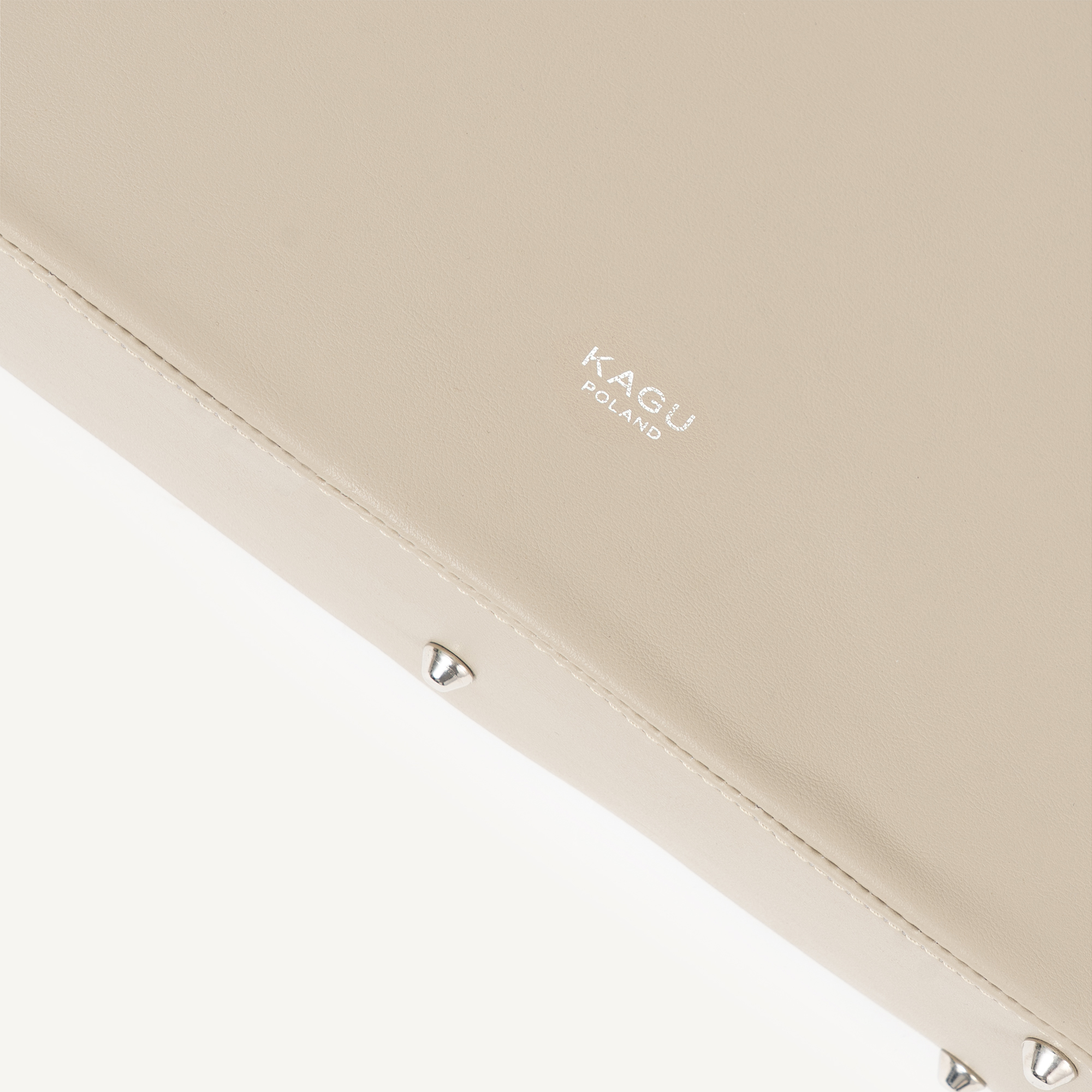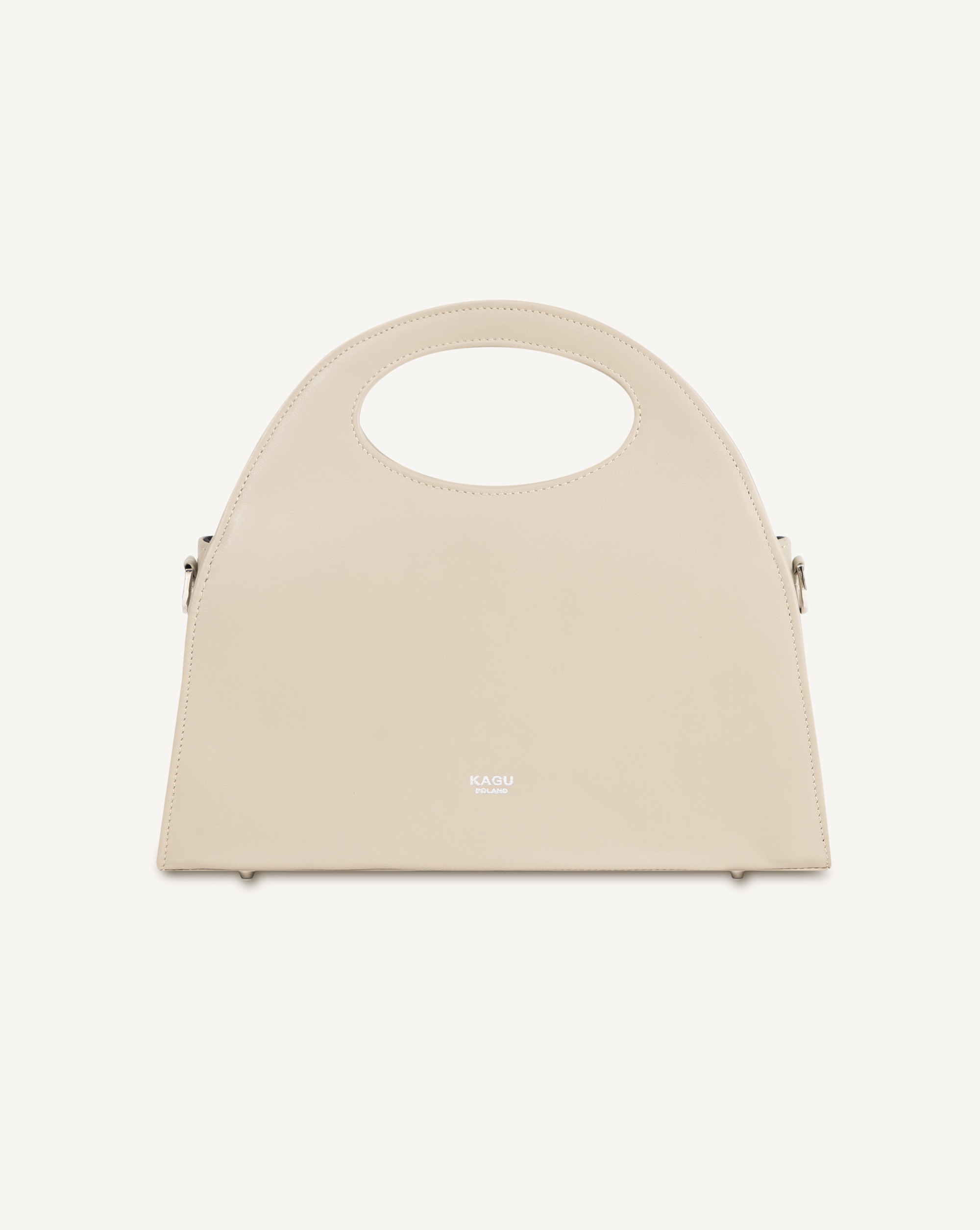 Torebka wykonana z bydlęcej skóry licowej. W zestawie z paskiem. Główna komora zamykana na zapięcie magnetyczne, wewnątrz kieszonka na suwak wpuszczona w boczną krawędź torby. Z przodu wybity srebrny stempel.