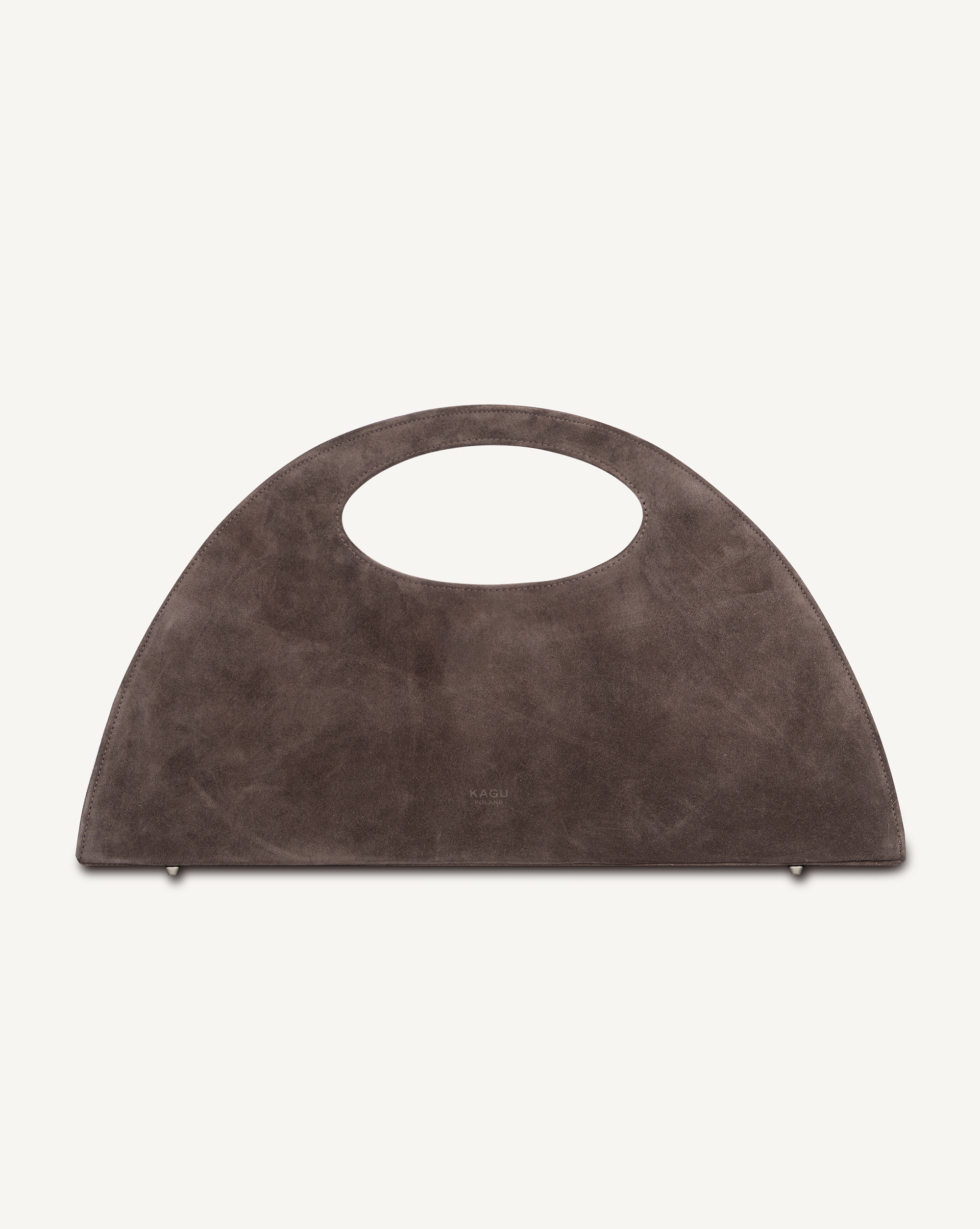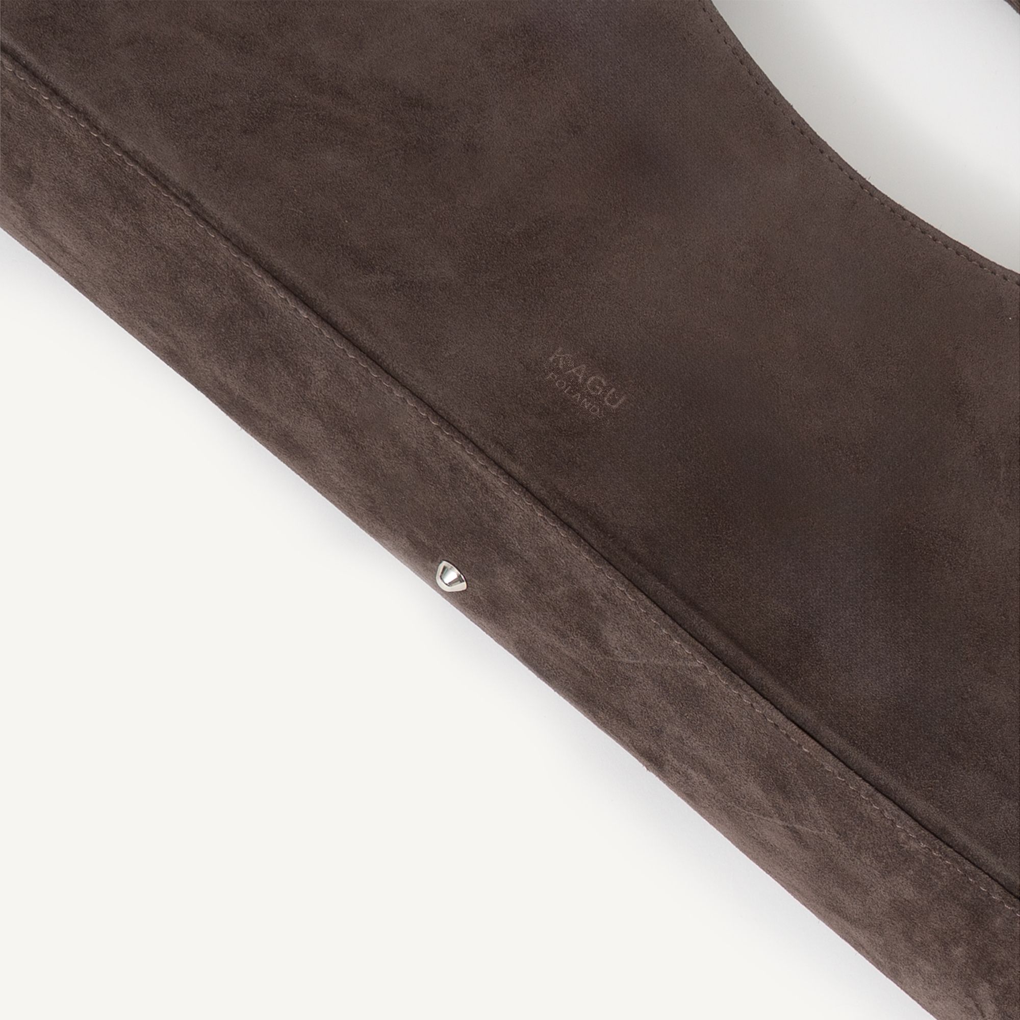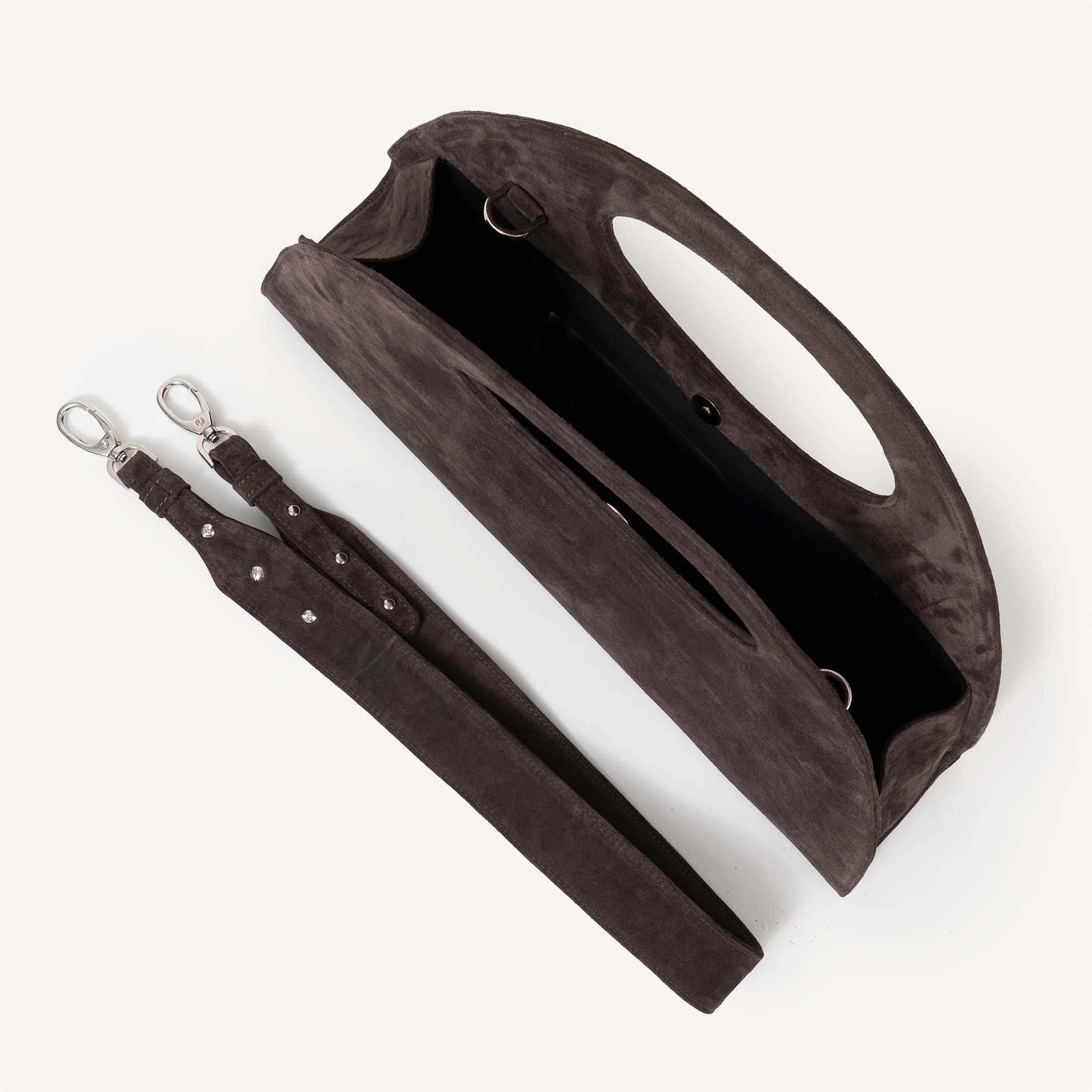 Torebka do ręki wykonana z brązowego zamszu. Główna komora zamykana na magnes, wewnątrz kieszonka wpuszczona w boczną krawędź torby. Logo tłoczone. W zestawie z paskiem.
