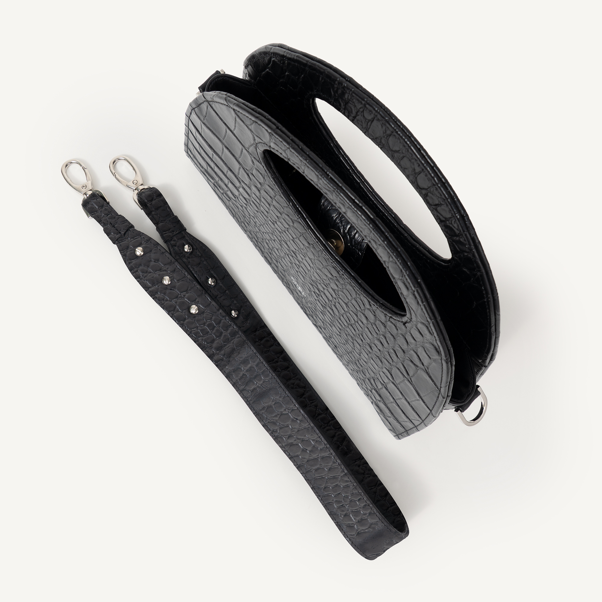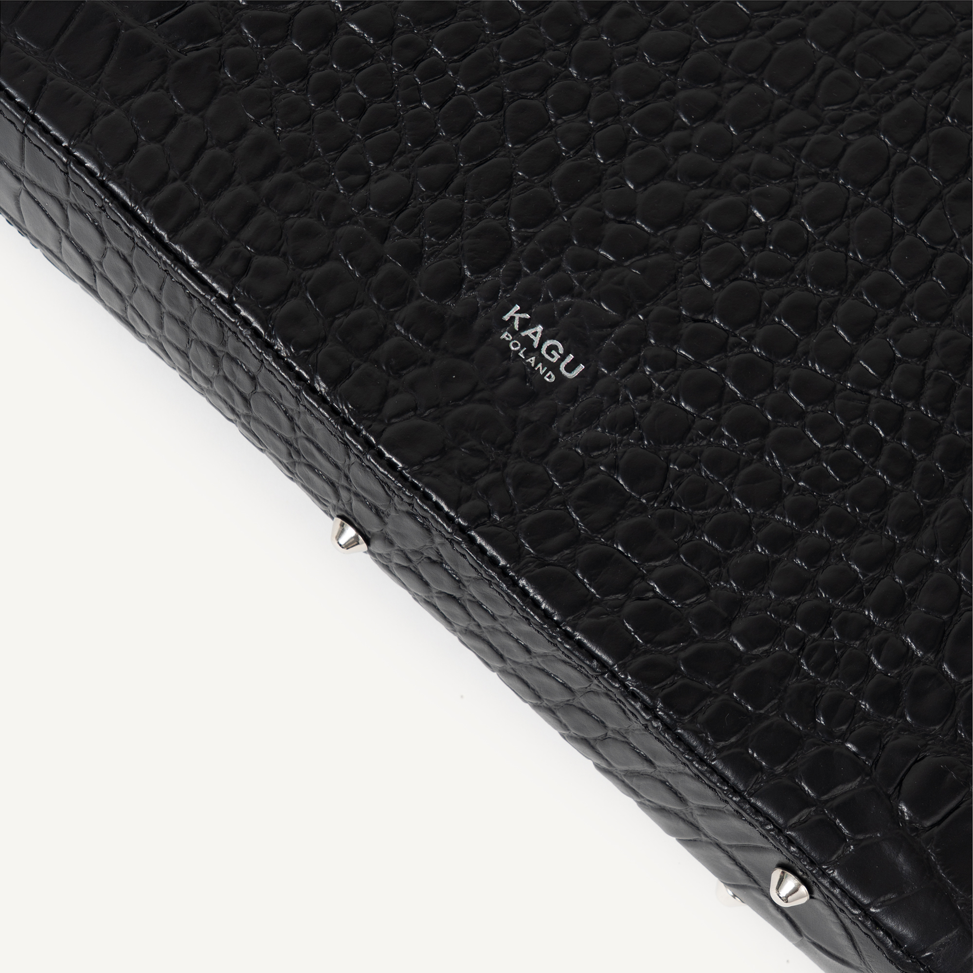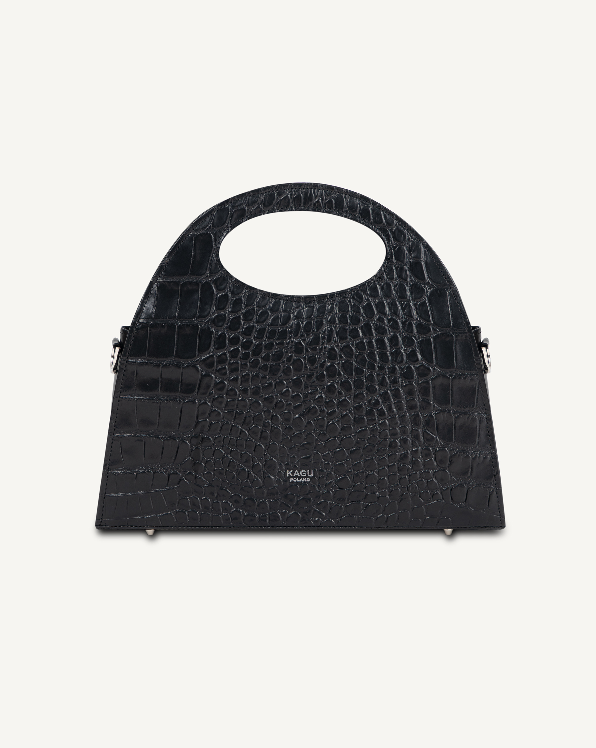 Torebka wykonana z bydlęcej skóry licowej. W zestawie z paskiem. Główna komora zamykana na zapięcie magnetyczne, wewnątrz kieszonka na suwak wpuszczona w boczną krawędź torby. Z przodu wybity srebrny stempel.