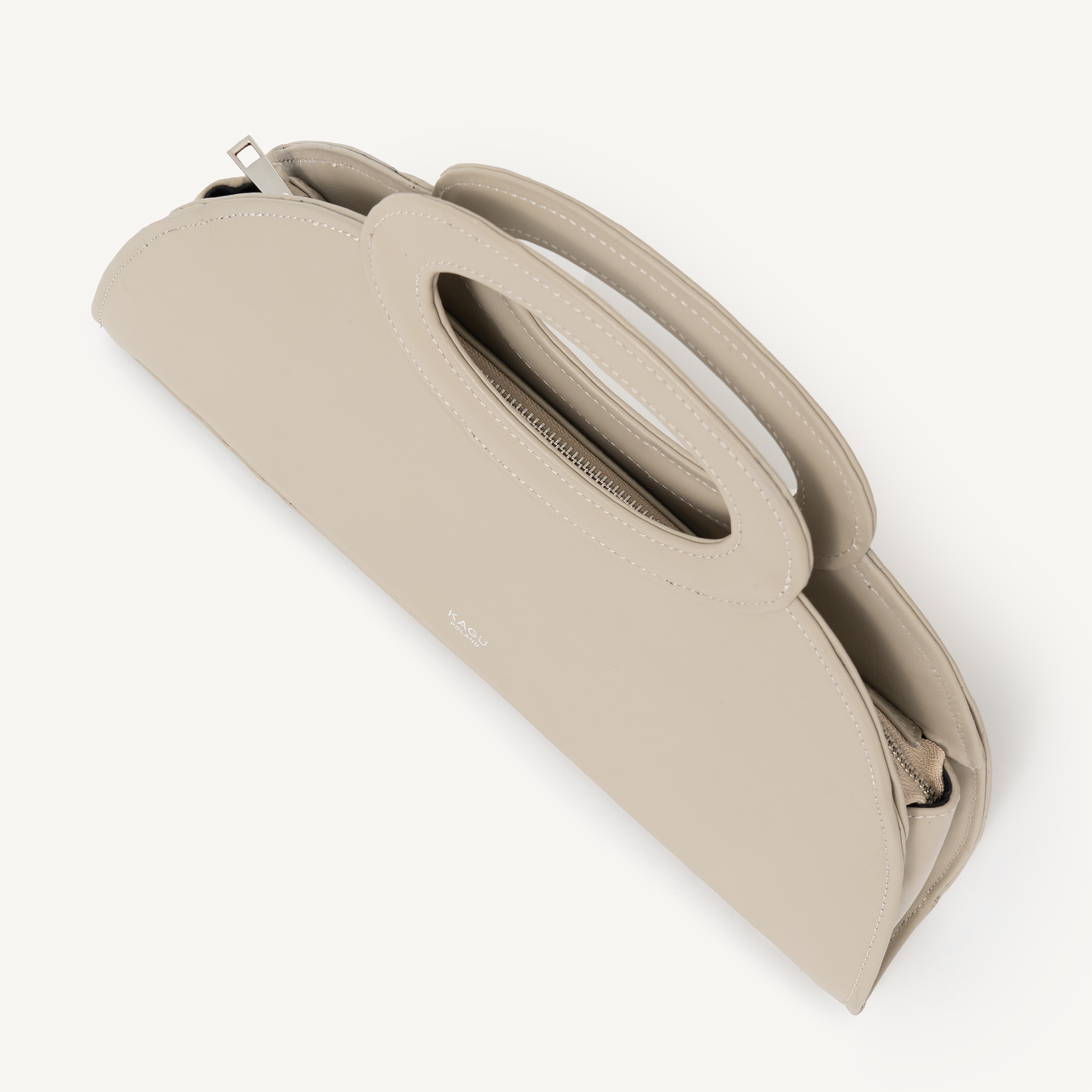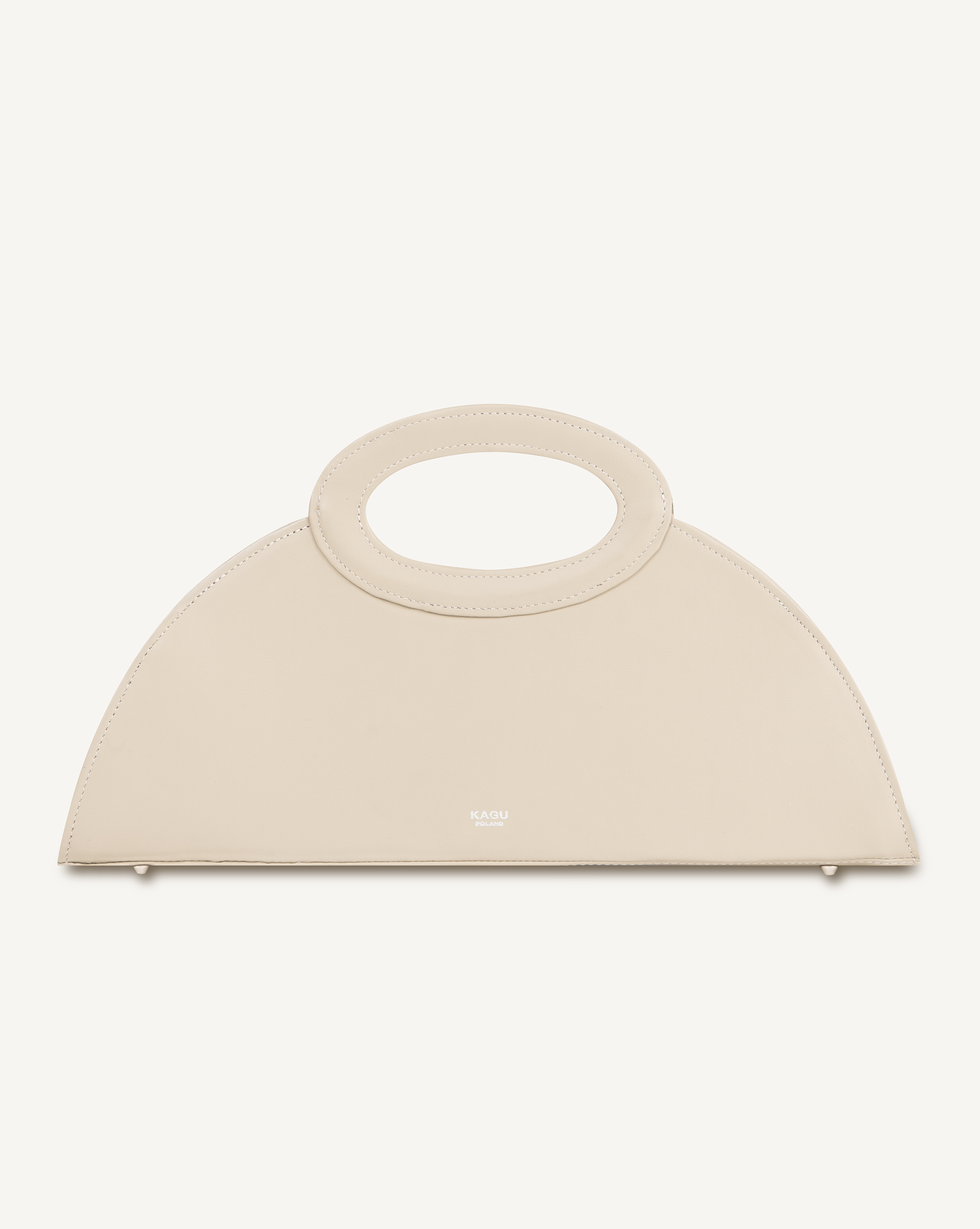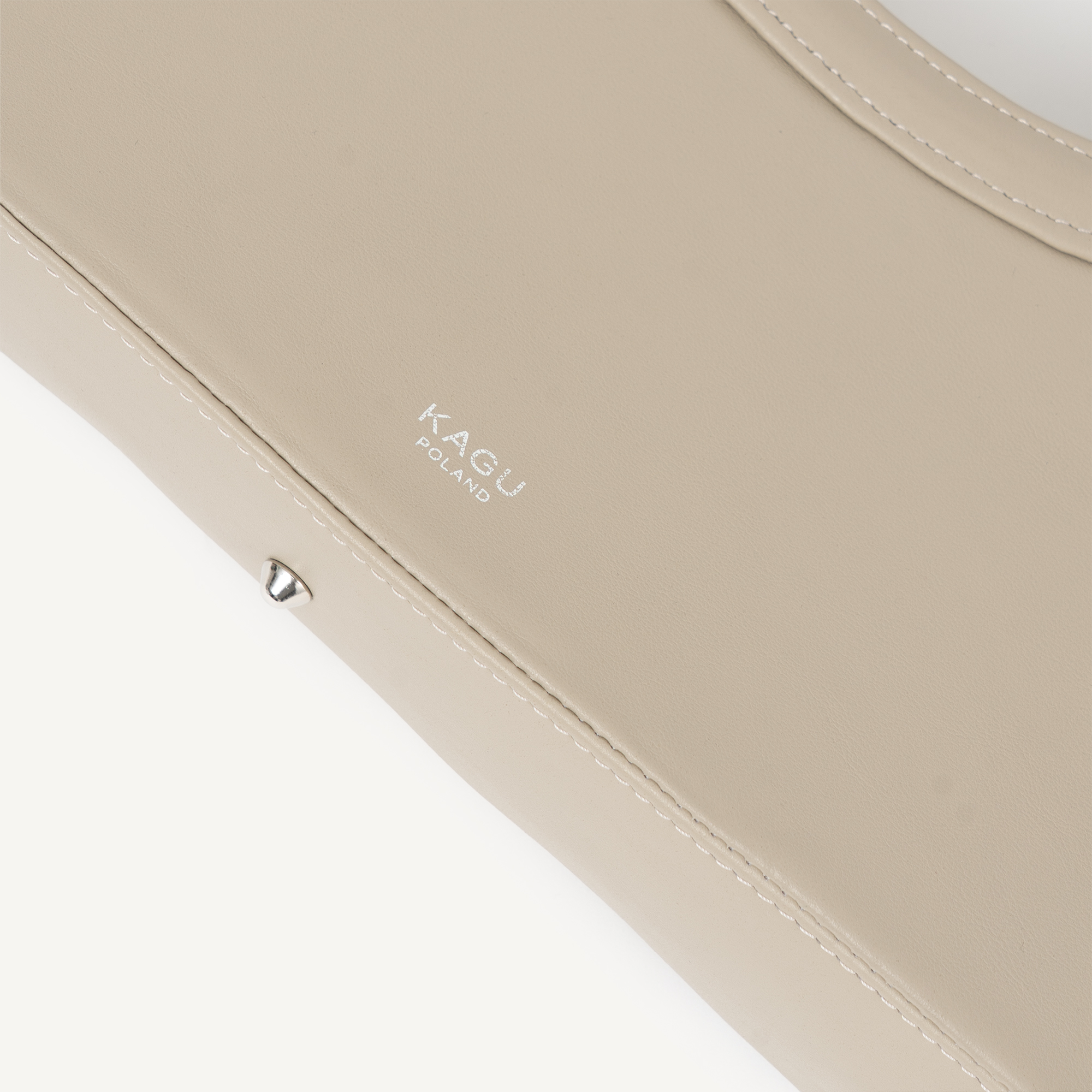 Torebka do ręki wykonana z bydlęcej skóry licowej. Główna komora zamykana na zamek, wewnątrz kieszonka wpuszczona w boczną krawędź torby. Z przodu wybity srebrny stempel.
